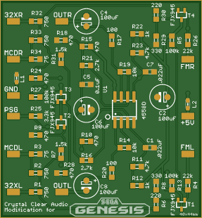 This PCB replaces the audio circuitry in VA7 model 1 and VA0, VA1 and VA1.8 model 2 Sega Genesis/Mega Drive systems.