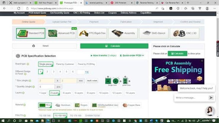 After generating all the manufacturing files, I moved to the PCBway home page to order for the manufacturing through the online instant quote page. Here, I started by inputting the size of the board, selecting the material and quantity of the boards, and selecting the layers of my board.