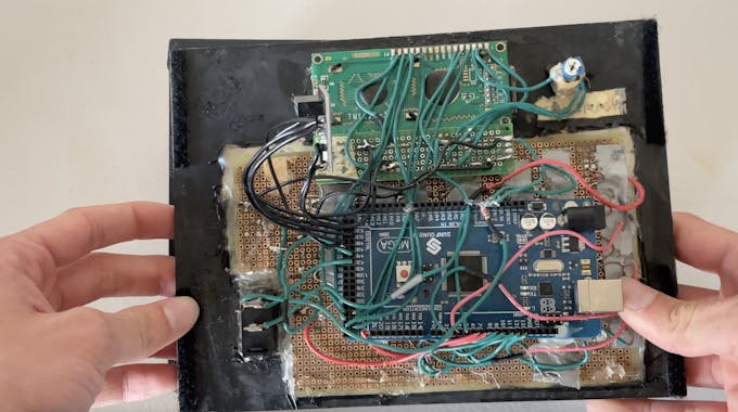 Onto the controller. Inside the base, there is a power circuit to power the Arduino MEGA, as well as another antenna to connect to the scoreboard. The front of the controller contains the more complex electronics. Here you can see the keypad, the screen, wireless module, switch, and of course, the Arduino MEGA.