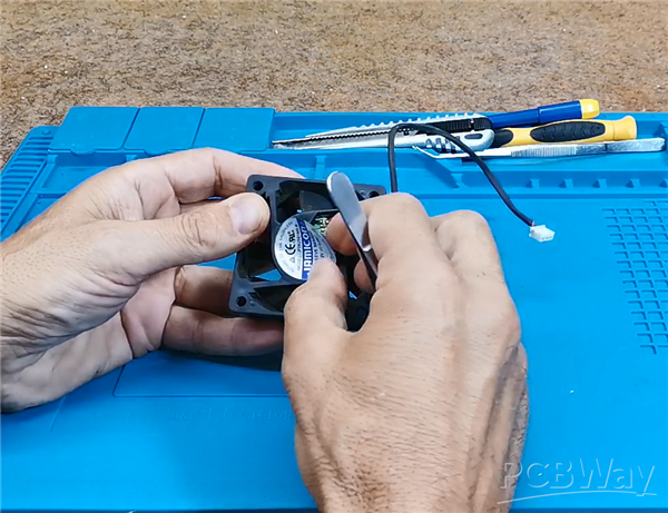 First I will explain the way to remove the sensor, which is basically the same for all types of brushless PC fans. In fact, I am specifically using a fan from an old UPS unit. First we need to remove the sticker with informations on the back, and then under it there is a rubber cover that covers the axis of the rotor.
