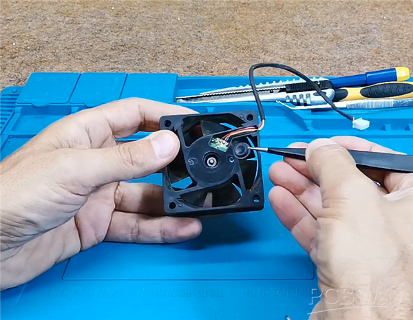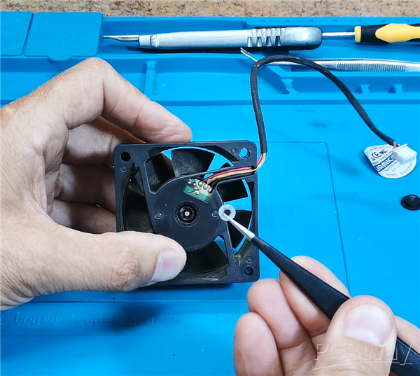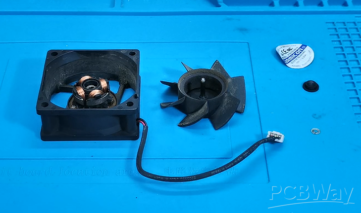 Otherwise, by default, this hole is used for lubrication if the fan is stuck, and we want to fix it. Next, we need to use a small screwdriver or tweezers to remove the plastic fuse, after which the rotor easily comes out of the bearing.