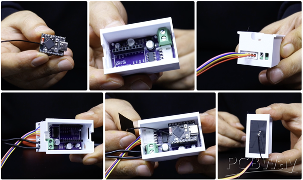 Place the PCB into the circuit enclosure. After connecting the stepper motor connector, connect the 5-volt power supply to the circuit. Next, plug the ESP32-S3 Mini into the PCB and route the antenna cable end outside the enclosure, which will significantly boost signal strength.