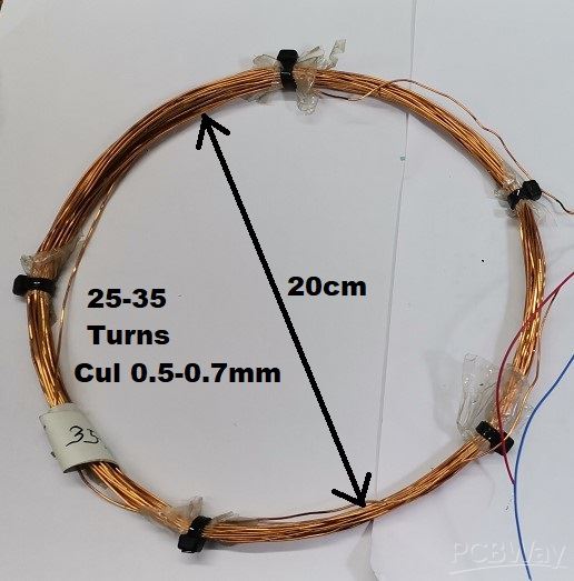 The coil is wound with wire 0.7 mm, with a 20 cm diameter, and consist of 25 turns, but as you can see, during the testing I used a sensor consisting of two serially connected coils with a diameter of 12 and 23 cm, each containing 20 windings.