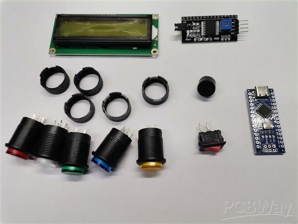 In this case, the "moles" will be small buttons with built-in LEDs in different colors. A randomly selected button lights up for a certain time when we have to press it to get a point.