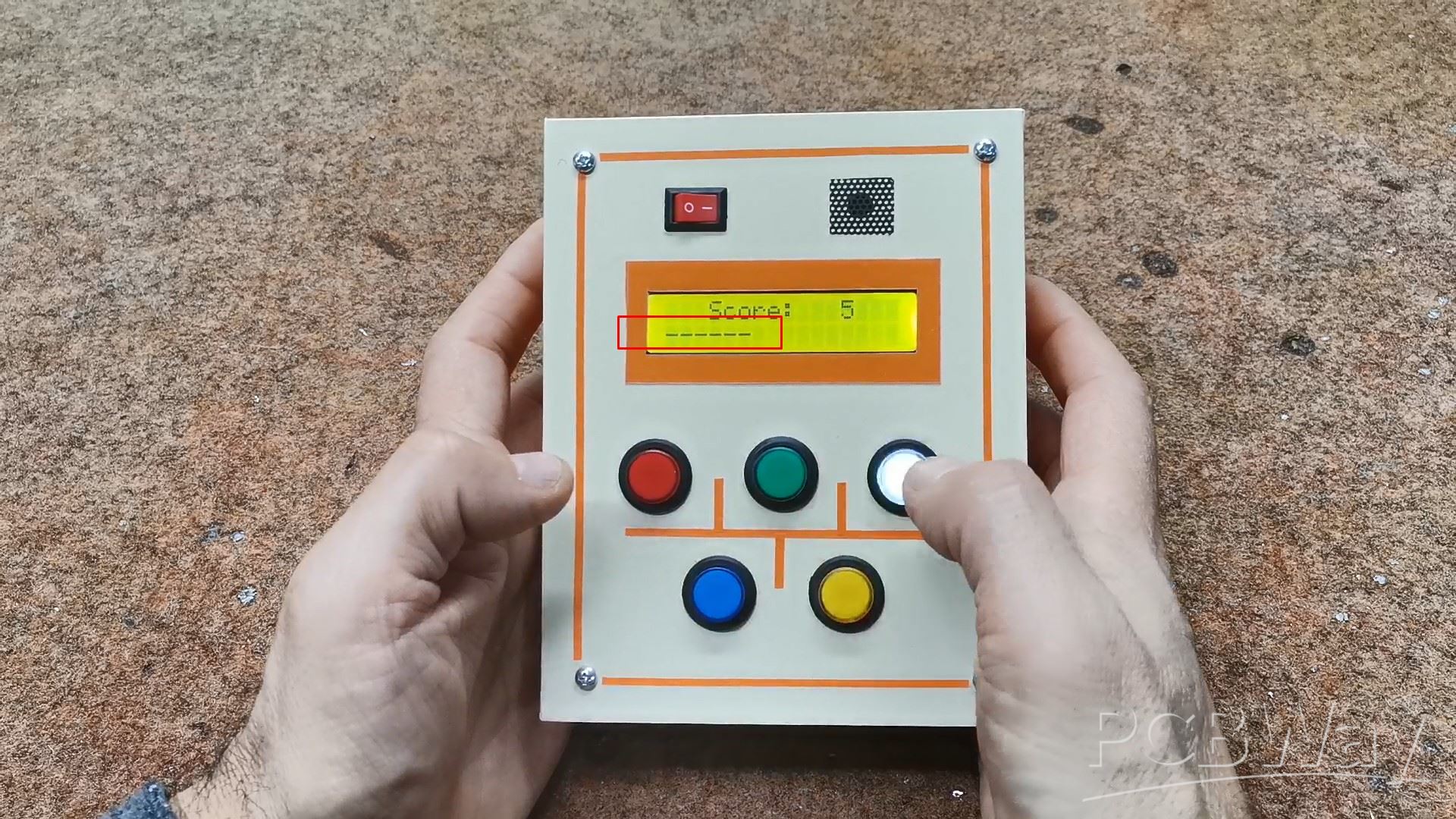 The start of the game is indicated on the LCD display and then the buttons start to light up in random order. With each successful press of a button while it is lit, we get a point. If we press the wrong button, we get a negative point and the score is reduced by 1.