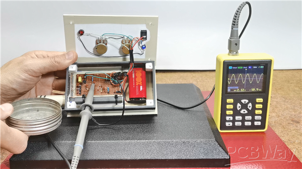 First, let me briefly explain the working principle. Part with the transistor and the two coils represents an oscillator with a frequency of about 20KHz. The amplitude of this sinusoidal signal can be changed in two ways. The first is by changing the value of this set of potentiometers, and the other is by bringing a metal object closer to the ferrite core on which the two coils are wound. In the second way, by bringing the metal closer, the amplitude of the signal decreases.