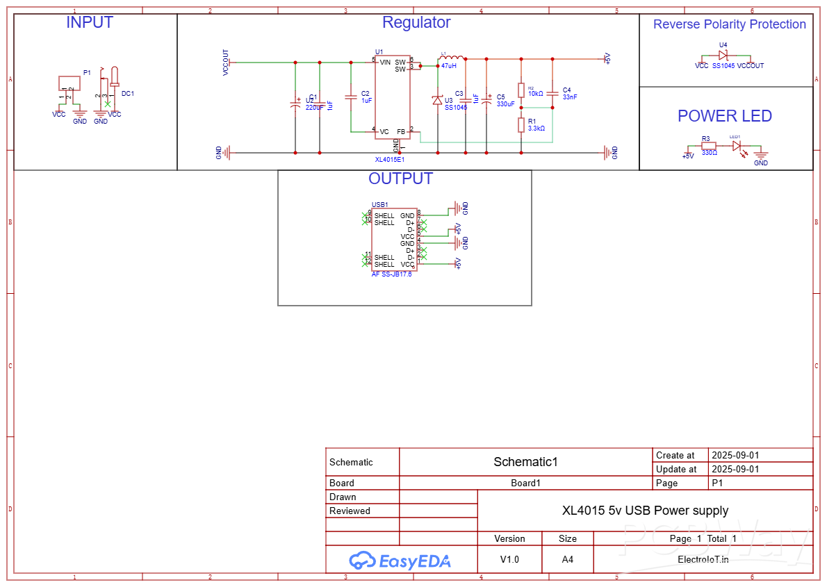 In this project, I designed and built a 5V/5A USB power supply using the XL4015 buck converter IC. The design includes reverse polarity protection, USB output ports, and indicator LEDs – making it a compact and reliable module.
