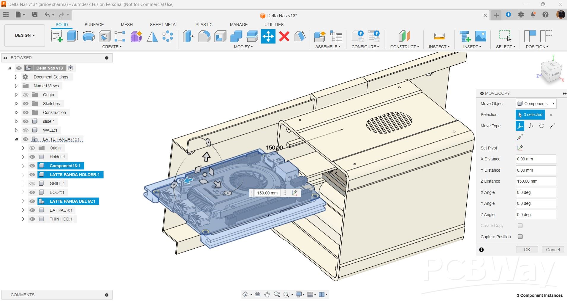 This project's design is straightforward; we took the Latte Panda 3 Delta 3D model to make a housing for the Latte Panda, Sata SSD, and a custom PCB on which we mounted the SMD Li-ion cell holders.
