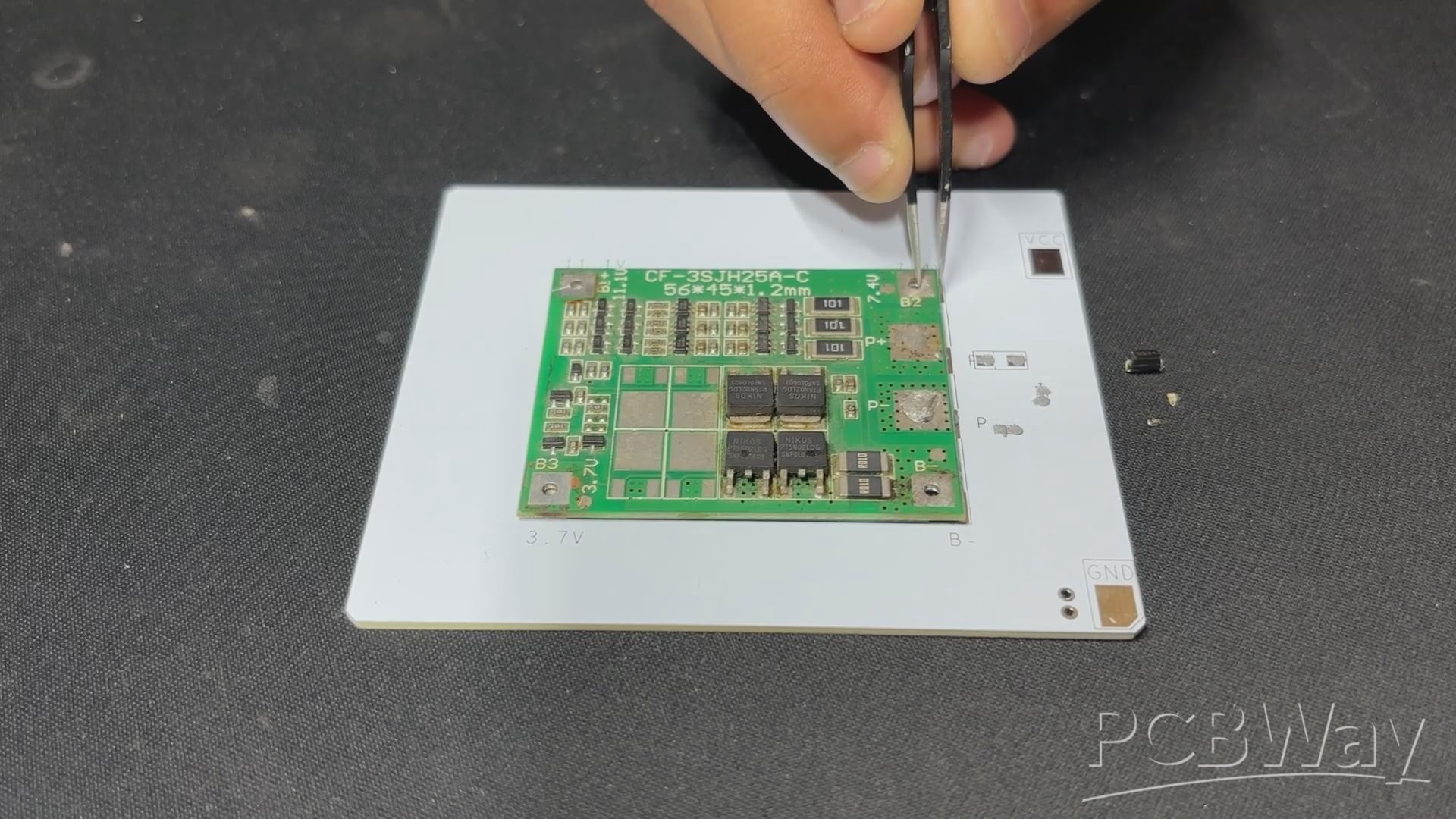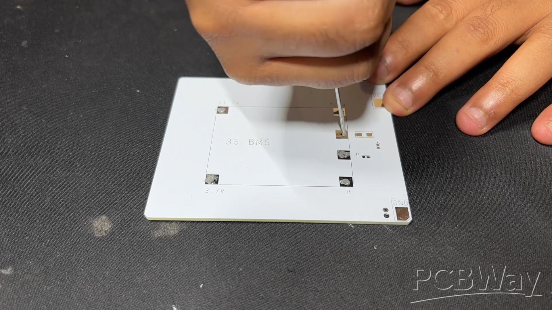 - After that, we pick every SMD component and place it, starting with the BMS and moving on to the diode, resistor, and LED.