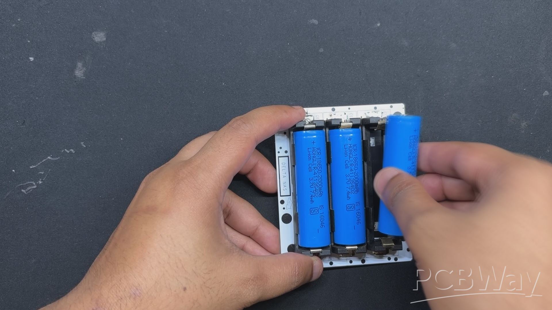 Here, the SMD 18650 cell holder was mounted on one side of the PCB, and the BMS was positioned on the other side. We also included an M7 diode to charge the cells, a 10K resistor, and a 0603 indicator LED, which illuminates when the battery pack receives 12V power by connecting the charger.