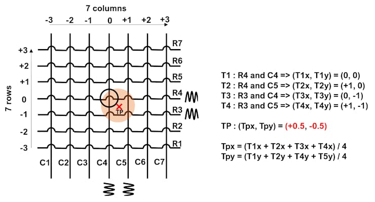The current can be controlled using a touchpad interface. This touchpad interface consists of 7 x 7 touch sensor array. These sensor lines are arranged in a matrix form. If touch is the orange color circle, the touch sensor line R4, R3, C4 and C5 are active. The touch sensor line is connected to the ESP32S3 microcontroller directly. The ESP32S3 microcontroller scans the touch sensor lines and detects the touch position. In this case, the touch position is (+0.5, -0.5).