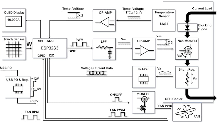 The DCEL operates by regulating the current consumption of the load device. It measures the current across the load using the shut resistor. The shut resistor voltage is I*R, where I is the current and R is the resistance of the shut resistor. The INA228 measures the shut voltage and sends it to the ESP32S3 microcontroller via I2C communication. The microcontroller processes current and adjusts the gate voltage of the MOSFET to control the load current. However, ESP32S3 does not have a DAC to generate an analog voltage. Therefore, I used a PWM signal to generate an analog voltage using a low-pass filter (LPF). The LPF filter out the high-frequency components of the PWM signal, resulting in a smooth analog voltage. The PWM signal is generated by the ESP32S3 as 14-bit resolution and 1kHz frequency. It can be generated the signal using the LEDC library. The LPF consists of a resistor and a capacitor. The resistor and capacitor values are chosen to achieve the desired cutoff frequency about 100Hz. The LPF output is connected to the OPAmp, which is used to amplify 3-times gain. The OPAmp output is connected to the gate of the MOSFET, which control the load current.