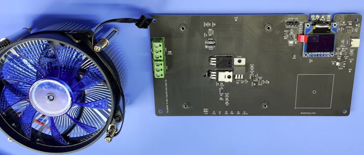 The MOSFET is mounted on between the board and heat sink. The MOSFET, Blocking Diode and temperature sensor just fit the heat sink. The DCEL has a heat sink temperature sensor to monitor the heat sink temperature. The heat sink temperature is measured by the LM75 temperature sensor. The LM75 outputs the voltage as temperature value. The voltage is Vout = 10mV/°C * T. Then, the voltage is amplified by the OPAmp with 2-times gain. The amplified voltage is connected to the ESP32S3 microcontroller to ADC function. The ESP32S3 microcontroller can read the heat sink temperature. And the heat sink has a fan to cool down the heat sink. The DC FAN needs power supply as DC 12V. The DC 12V is supplied by the USB PD. The fan power is controlled by a MOSFET switch.