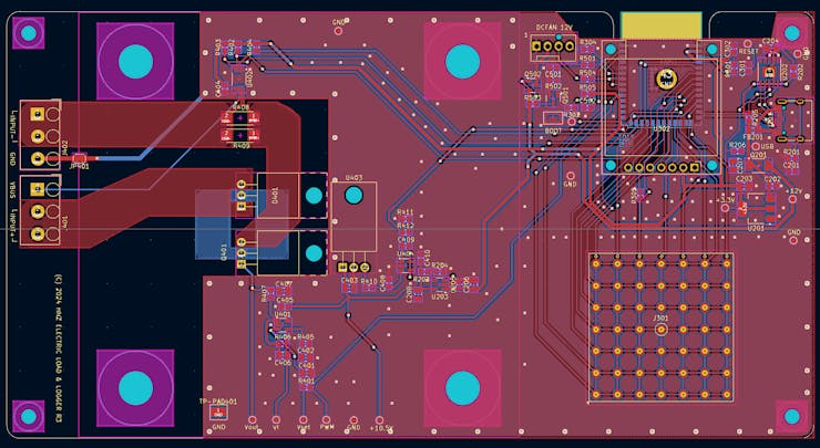 Since the load current path is designed to handle up to 10A, the current path is designed to be wide. And GND line is separated from the load current path. The INA228 is placed near the load current path.