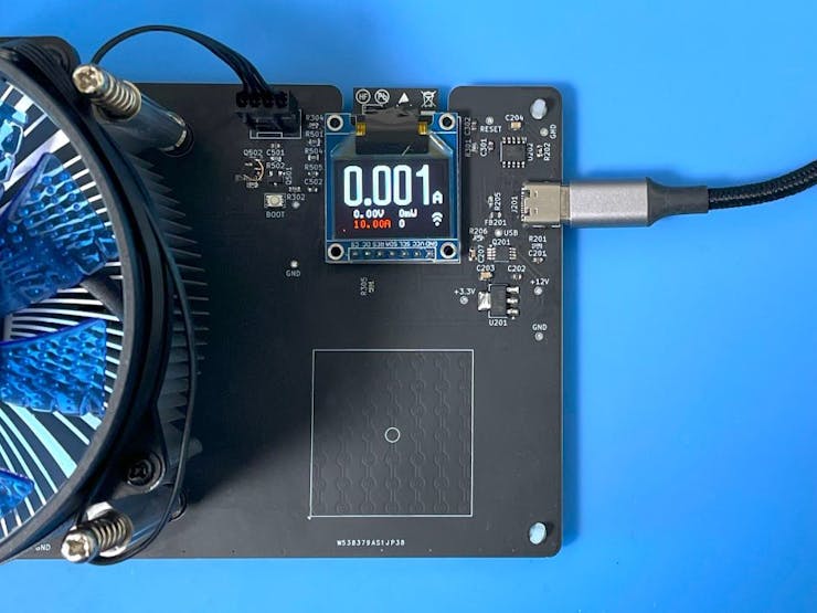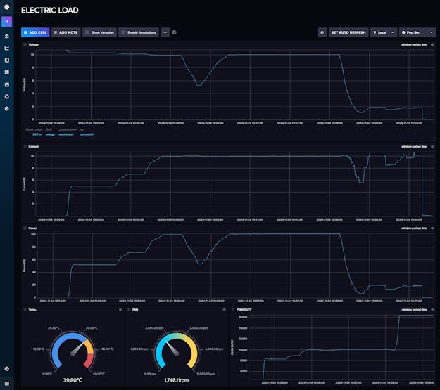 The ESP32S3 microcontroller processes the measurement data and sends it to InfluxDB server via WiFi. The ESP32S3 microcontroller has a WiFi module to connect to the WiFi network. The ESP32S3 microcontroller sends the measurement data to the InfluxDB server using the HTTP POST method. The InfluxDB server stores the measurement data in the database. The measurement data can be visualized using the dashboard graph. You can see the real-time measurement current, voltage, power, heat sink temperature, the PWM value and fan speed.