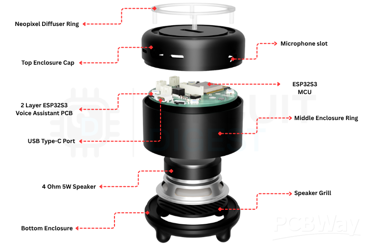 Audio Capture: Once awoken, the dual MEMS mic array records audio with noise cancellation via Espressif’s AFE. Circuit Digest