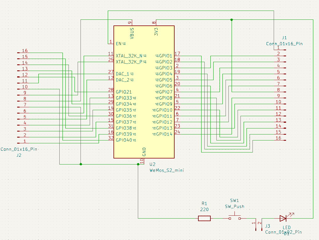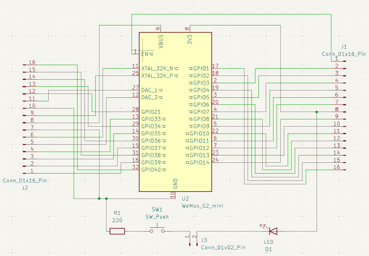Simple components (led and push button) are added in case we need to debug the ESP32 S2 mini quickly.