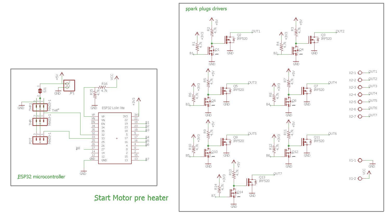 Note that two resistors pull down the gates of the mosfets for each glow plug. So that , when power is applied, the glow plugs are switched off electrically. Then, after boot, the ESP32 can safely take again the control.