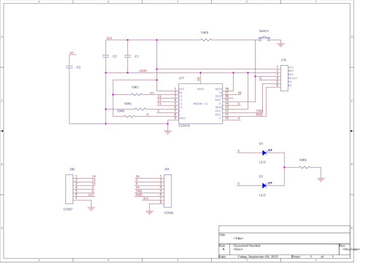 We start first by preparing a basic schematic of the ESP-WROOM Module by following its minimal configuration setup in the datasheet and replicating it into the PCB CAD software.