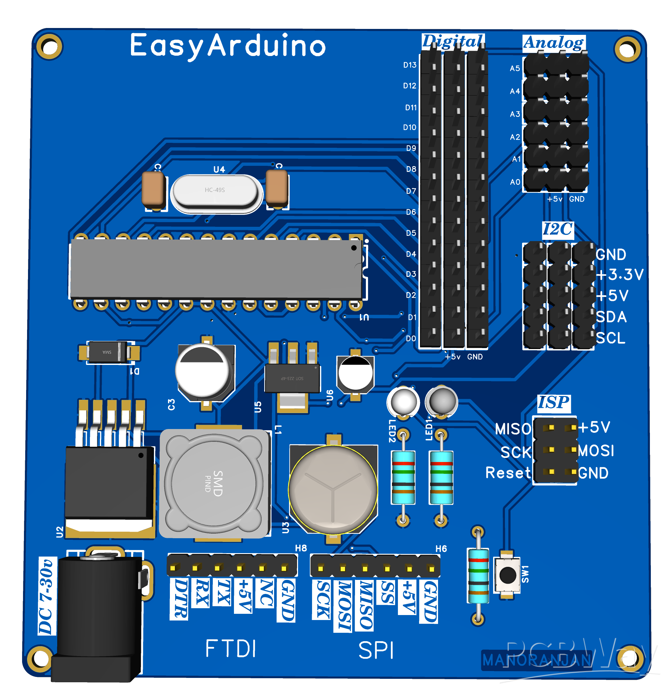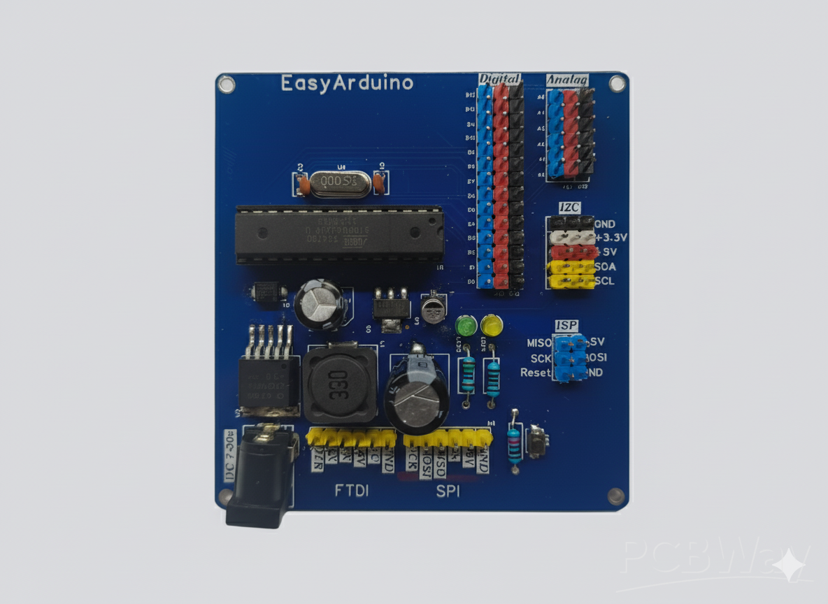 A beginner-focused custom Arduino Uno-compatible board designed for learning, soldering practice, and sensor experimentation.