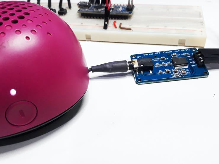 The mp3 module is controlled through commands received by the Arduino serial. In this process, we used the SoftwareSerial library and emulated a serial on the Arduino digital pins.