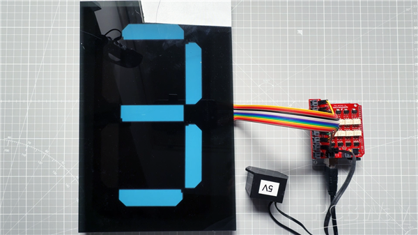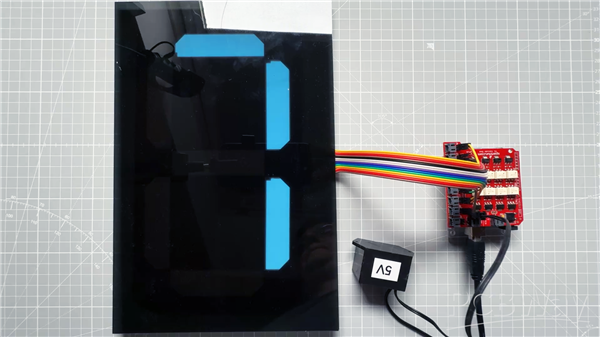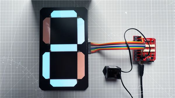 Electroluminescent 7-segment display with Arduino UNO and Sparkfun EL Escudo Dos board with custom PCB, using pre-cut electroluminescent panels.