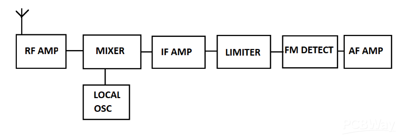 The block diagram above is a good illustration of how the receiver works. The FM signal is received by the radio antenna and pushed into the RF amp which is a VHF amp that is tuned to FM bands and rejects any other type of frequencies. From RF, the signals move to the mixer which does the work of mixing the input signals with another one from the local oscillator. This is the tuning and at the end of the tuning, we end up with two brand new frequencies that is the incoming signals with and without the frequencies from the local oscillator. One is known as the intermediate frequency that is sent to the FM detector which will convert the frequency to voltage and do the extraction of the audio modulation and get amplified by the AF amplifier.
