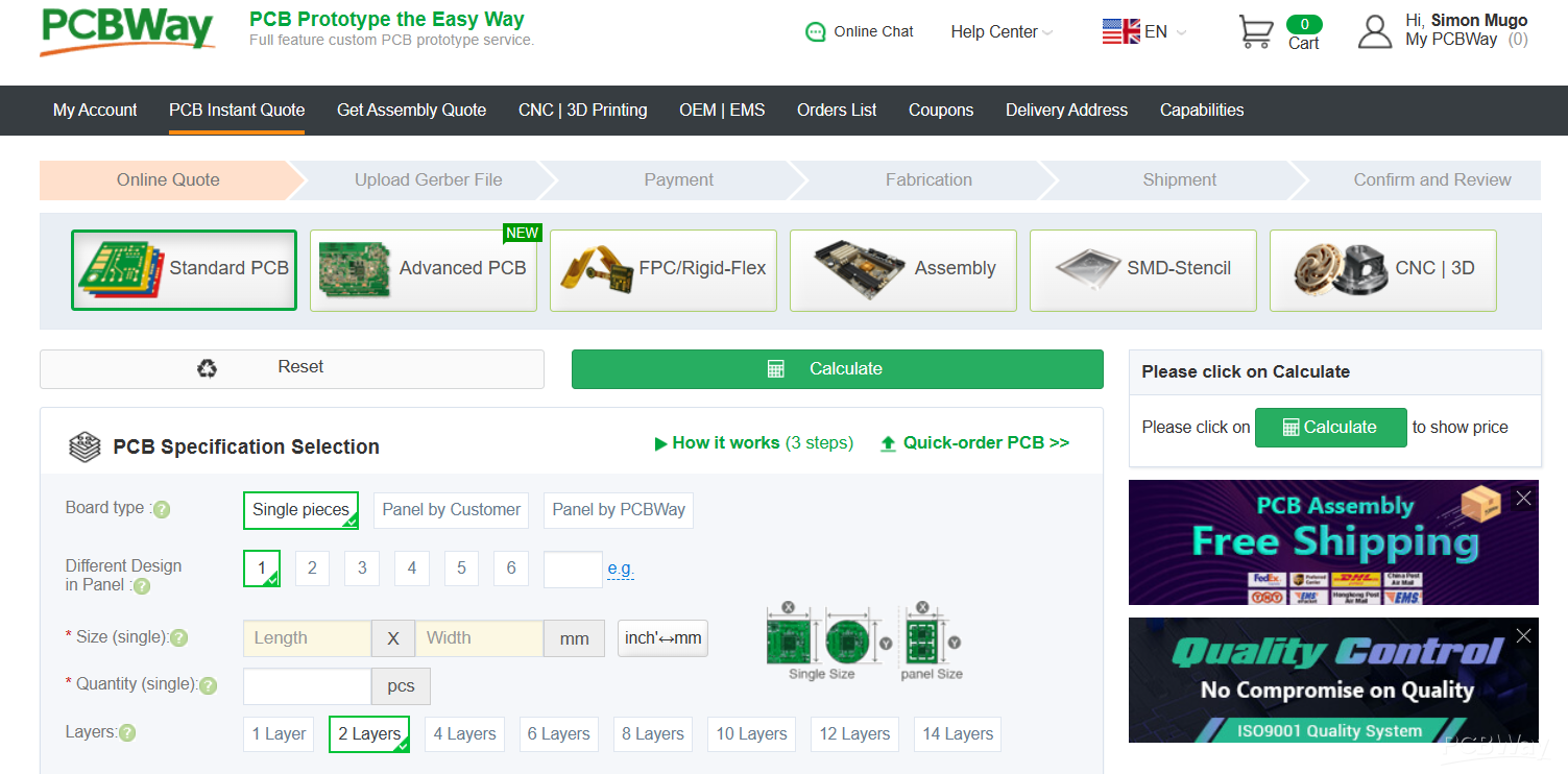 To order on their site, just click on the PCB Instant quote and you will not get disappointed.