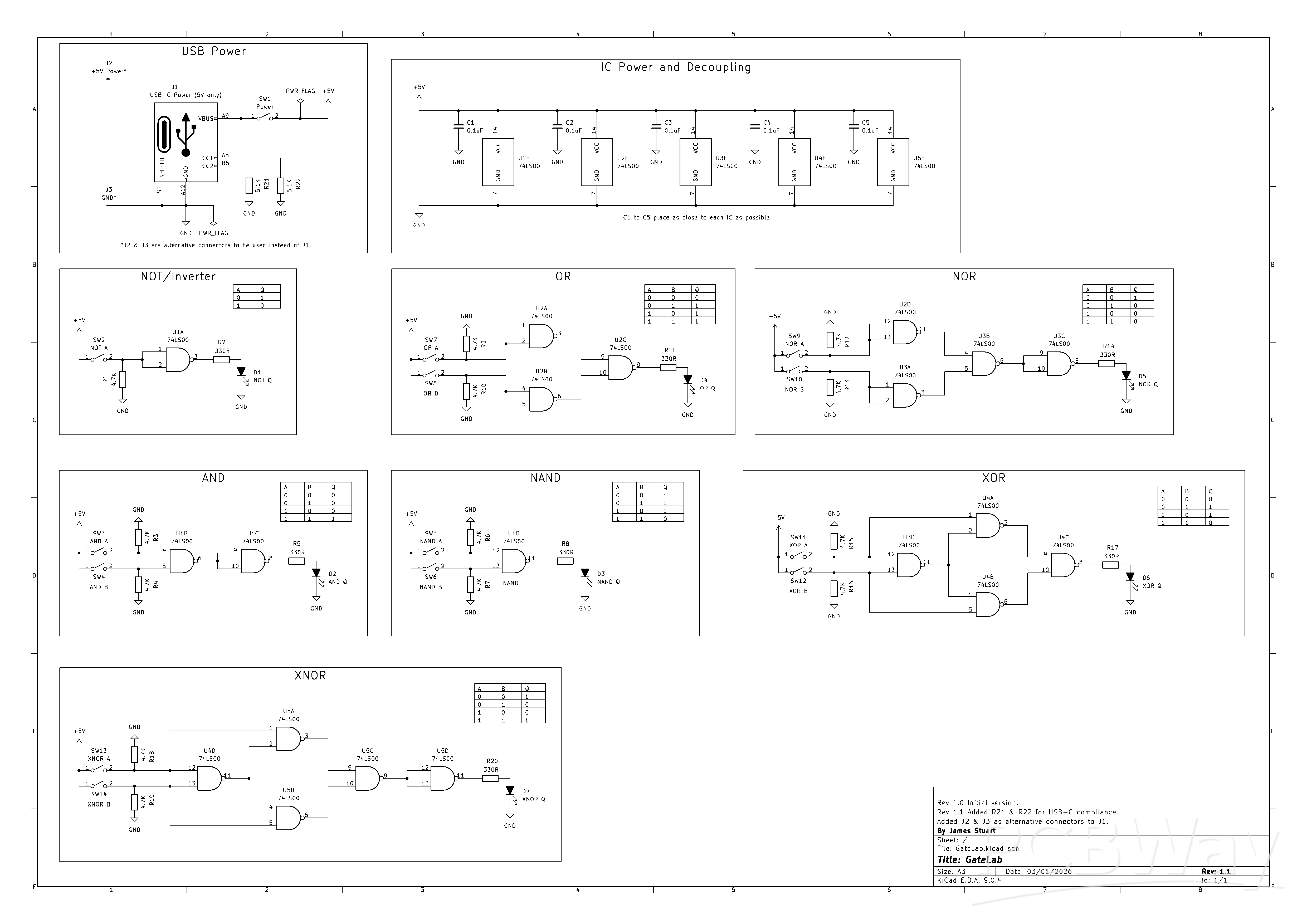 I would like to do another version of GateLab in the future, in particular shaping the PCB to form a NAND gate, and providing the ability to easily hook up remote inputs and outputs.