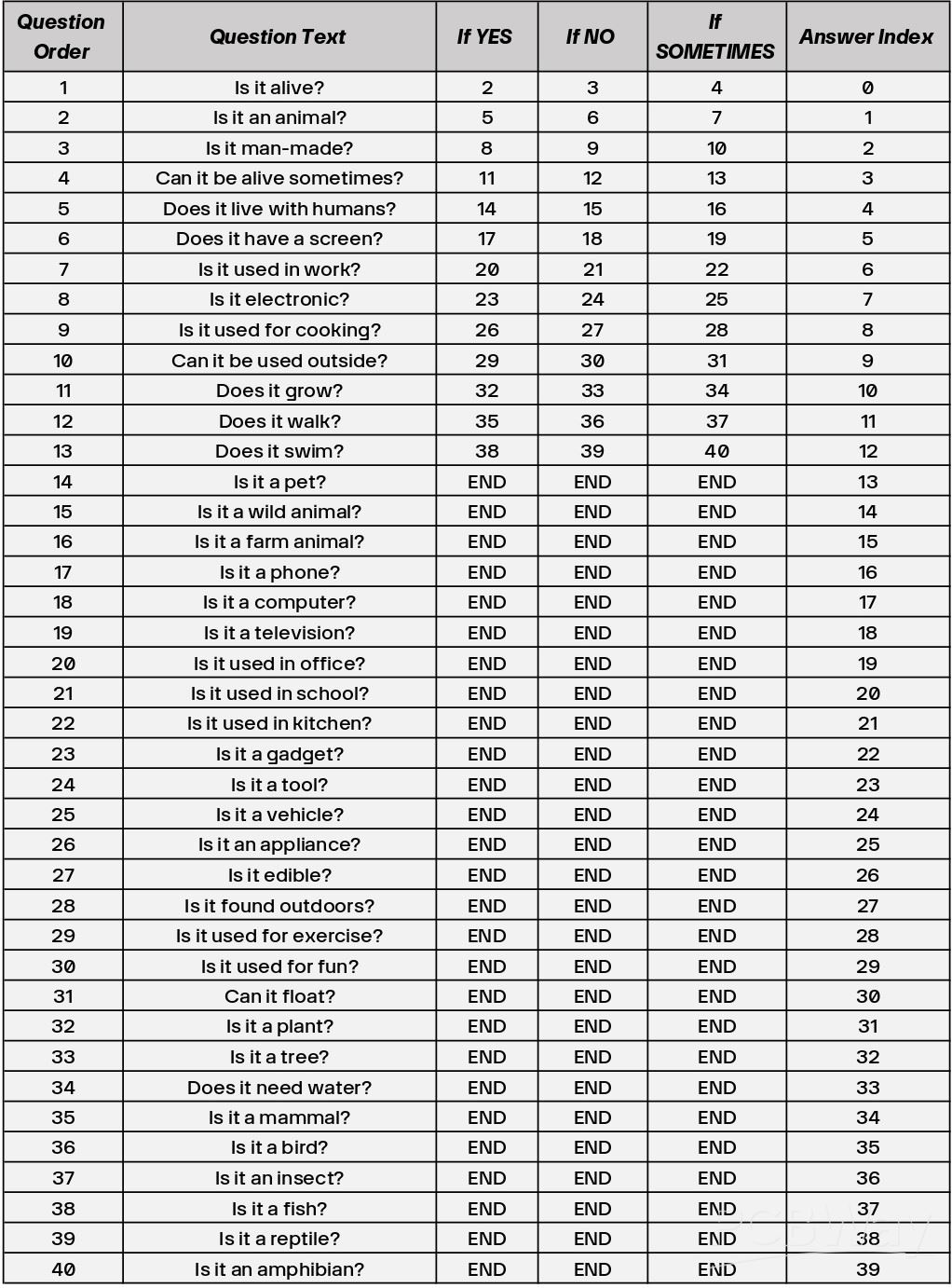 It all starts with the first question: “Is it alive?” If the user says YES, the game jumps to question 2: "Is it an animal?" Another YES takes us to question 5: "Does it live with humans?" And so on.