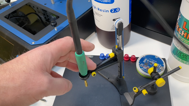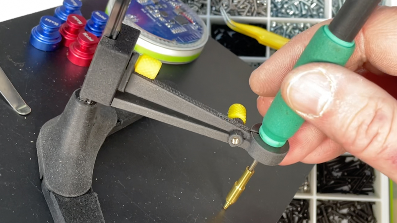 The tool easily adapts to different types of soldering irons. The kit includes holders for the compact T210 handle with a modified insert installation tip and for the Hakko T12 tip handle. Mounting diameters are 9 and 13 mm. A STEP file is also included, in case you need to adjust it for your own tool.