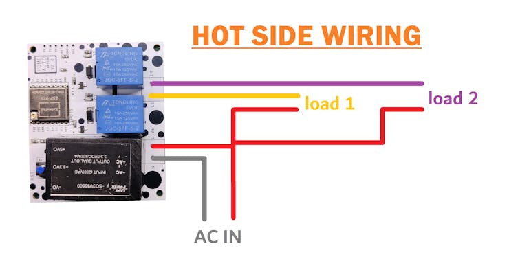 The hot side wiring is straightforward: we connect an alternating current supply to the board's AC CON, as well as live and neutral wires.