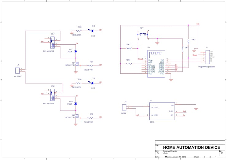 We include two relays in the design to control the outputs. The gates of the relays are connected to GPIOs 4 and 0, and each relay is controlled by two N-Channel Mosfets set up in a switch configuration.