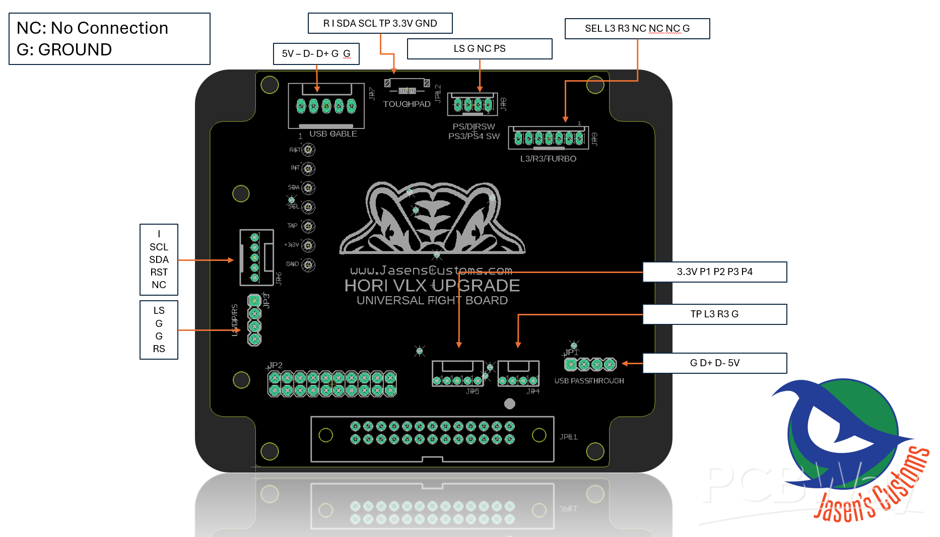 This design, by JasensCustoms.com allows easy installation of a modern fight board into the PS4 VLX without damaging any of the stock wiring. All functions work except touch pad tracking after install, solely because touch pad tracking has not been integrated into most replacement fightboards. This was originally designed when the Brook Universal Fighting Board was atop of the market. Any of their boards that match the footprint of the UFB (all of them mechanically) will work. The wiring may be slightly different on the JST connectors though and you may need to create custom wiring to connect them properly. DigiKey sells pre-crimped JST PHR wires which makes this trivial.