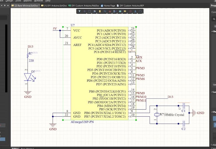 In order to make our Arduino board, we will need a microcontroller, which will be the one doing all the mathematical calculations and doing all the logical decisions. So which microcontroller do we use in our Arduino Board? Here, will be using an ATMega328. The microcontroller can’t operate without the bare essentials. In order to function, it just needs a minimal amount of setup. Let’s look at the bare minimum configuration.