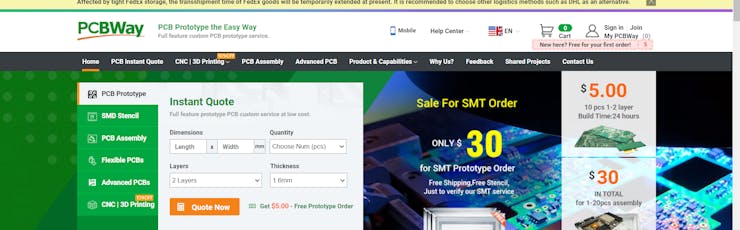 To order your PCB from PCBWay, go to the PCBWay website and fill in the basic board details in the instant order form. From there you will be directed to a form where you can provide more elaborate board details. Update your board information in the PCB specification screen.