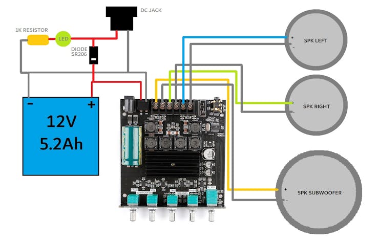We connect the positive and negative terminals of the Left-Right Speaker to the ZK-TB21's Left and Right speaker connectors.