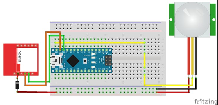 The Arduino reads the PIR sensor and checks whether or not the presence of intruders is being detected. If the sensor detects movement of people, an SMS alert will be sent through the SIM800L module. This message will be received by the business or home owner.