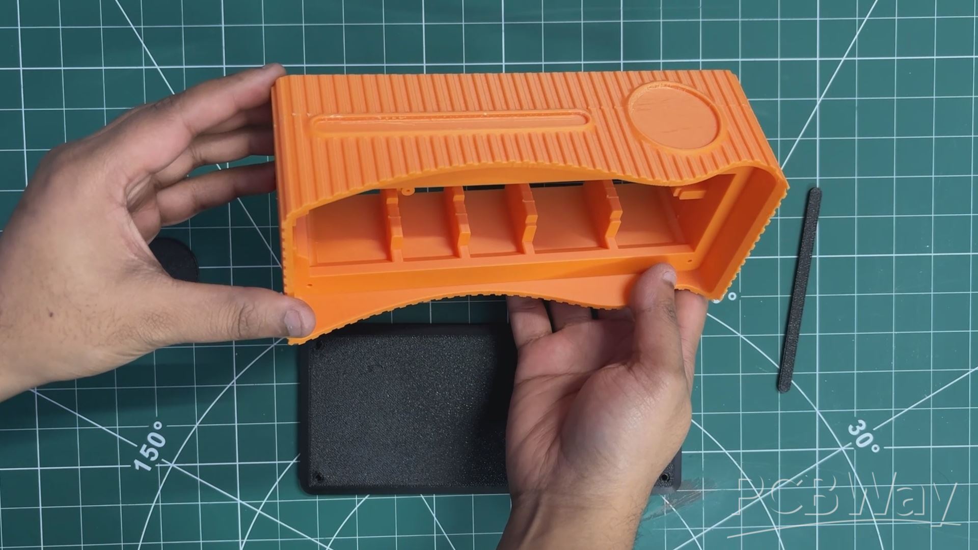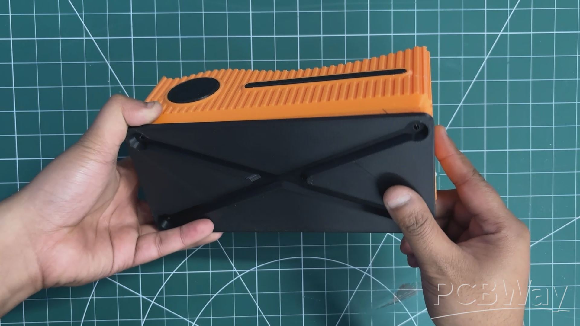On the front, we added two extra parts purely for aesthetics—these “accent parts” create a clean two-tone effect and are pressure-fitted into place. Finally, we designed a separate base piece that attaches from the bottom and locks onto the main enclosure, which we refer to as the main body.