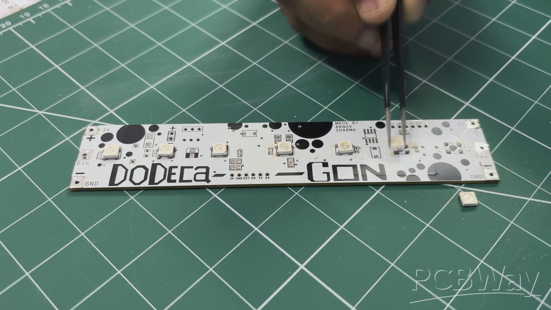 - Next, each RGB LED is carefully picked and placed onto its footprint, making sure the orientation is correct.