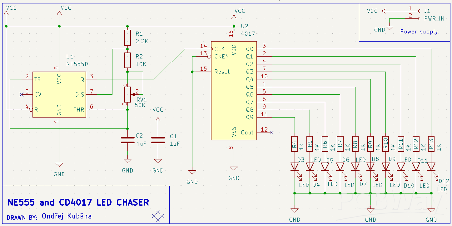 -The NE555 is configured as an astable multivibrator, generating continuous clock pulses that drive the CD4017. Each pulse from the 555 advances the CD4017’s output, turning on one LED at a time in sequence. Once all 10 outputs are used, the CD4017 automatically resets and starts again, creating a smooth running-light or chasing effect. The chase speed can be adjusted by changing potentiomer connected to the NE555.