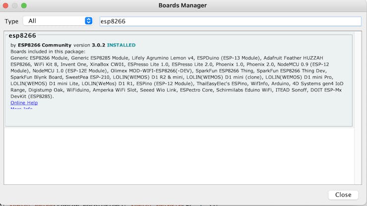 Type ESP8266 in Board Manager Search bar which will show the result just select & click on install.