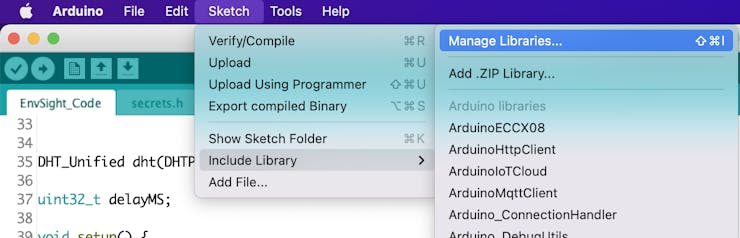 After installation of boards 2 libraries are required for DHT11/DHT22 sensor & ThingSpeak Cloud Click on Sketch -> Include Library-> Manage Libraries...
