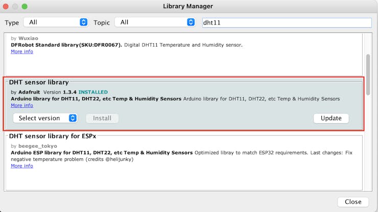Firstly type DHT11 in search bar and you will get alot of results just select the DHT Sensor Library by Adafruit.