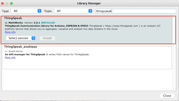 Now Type Thingspeak in the search bar and only install by MathWorks.