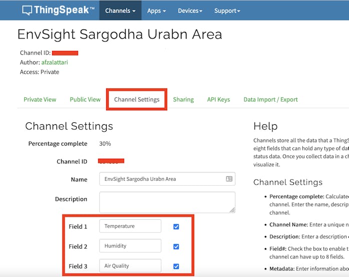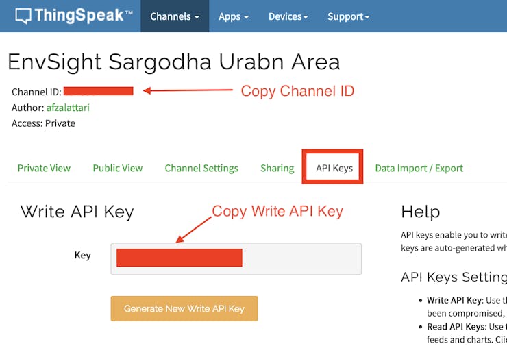 After adding channel fields now click on API Keys which will be later used in Arduino Code for cloud connectivity. Copy the Channel ID & Write API Key
