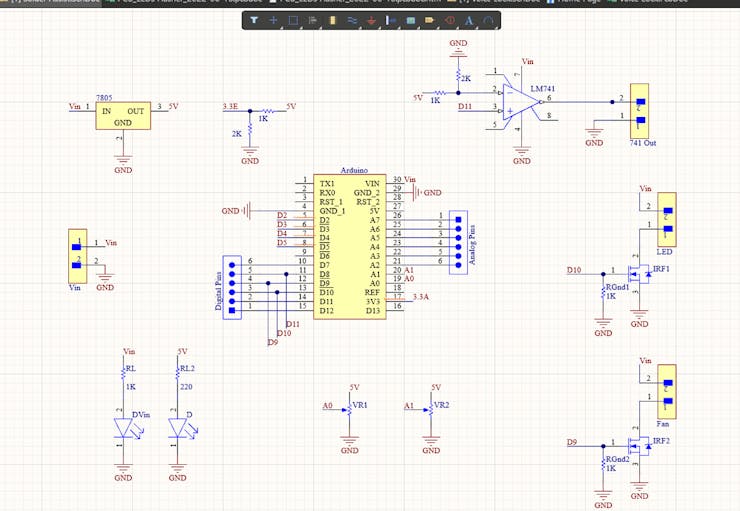 Simply turning the potentiometer allows us to control not only the level of brightness produced by the LED strip but also the rate at which the fan rotates. A pipe or an outlet, to which this fan can be attached, can be used to ensure that the vapors do not remain contained within the room.