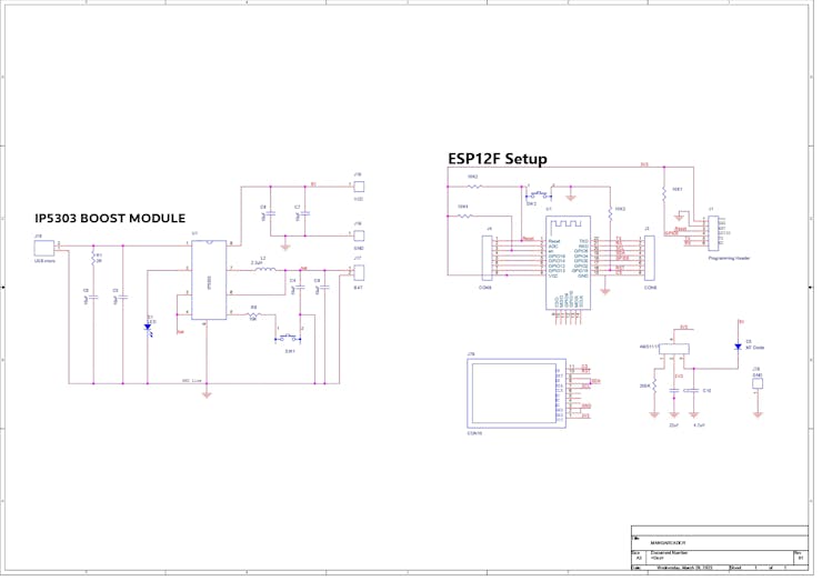 An IP5303 IC setup, a power management IC that converts 3.7V of a lithium ion battery to 5V for charging a smartphone or powering any 5V device, is used to power the ESP setup.