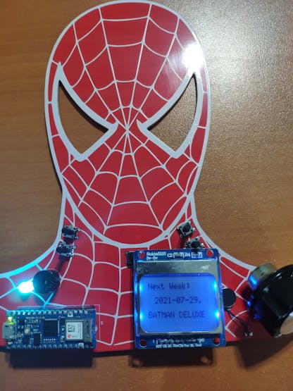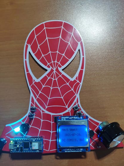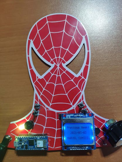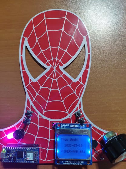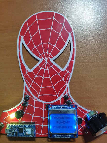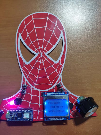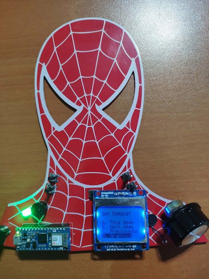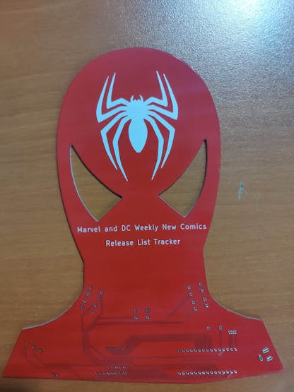 After completing wiring on a breadboard and testing the code, I designed a PCB (Comics Release List Tracker) inspired by one of my favorite comic book heroes: Spider-Man. It became a stylish and suitable addition to my comic book collection as an efficient new comics release list tracker with some spectacular features :)