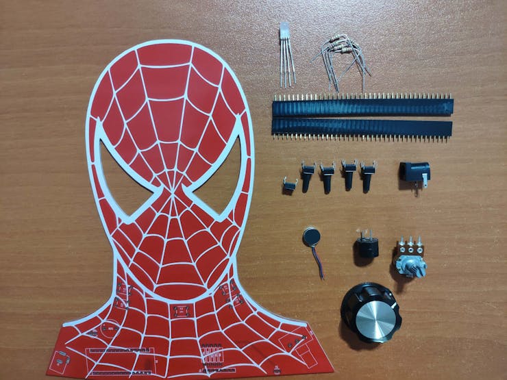 First of all, by using a soldering iron, I attached headers (female), buzzer, potentiometer, vibration motor, 5mm common cathode RGB LED, 6x6 pushbuttons, 1K resistors, and the power jack.